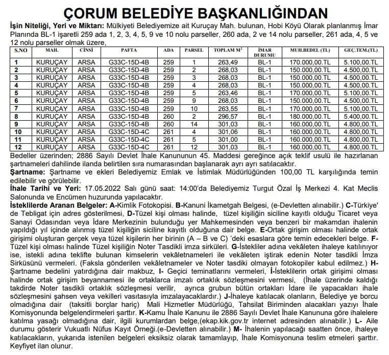 17 Mayıs 2022 Salı günü Saat 14.00’te Turgut Özal İş Merkezi 4.Kat Belediye Meclis Salonu’nda satışı yapılacak arsaların listesine https://ihale.corum.bel.tr/ihale/12-adet-arsa-satisi-hobi-koyu internet adresinden ulaşılabiliniyor.