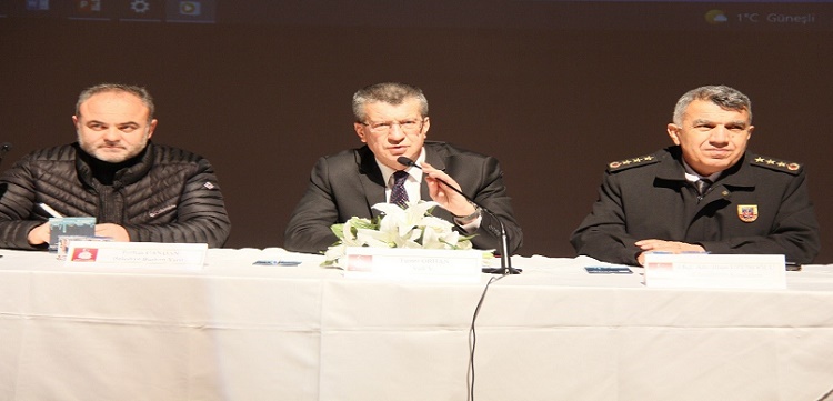 Devlet Tiyatro Salonu’nda düzenlenen toplantıya, İl Jandarma Komutanı J. Kd. Alb. İlhan Uzunoğlu, İl Emniyet Müdür Yardımcısı Cemil Erdemli, Belediye Başkan Yardımcısı Turhan Candan, İl İdare Şube Başkanları, merkez mahalle ve köy muhtarları katıldı.
