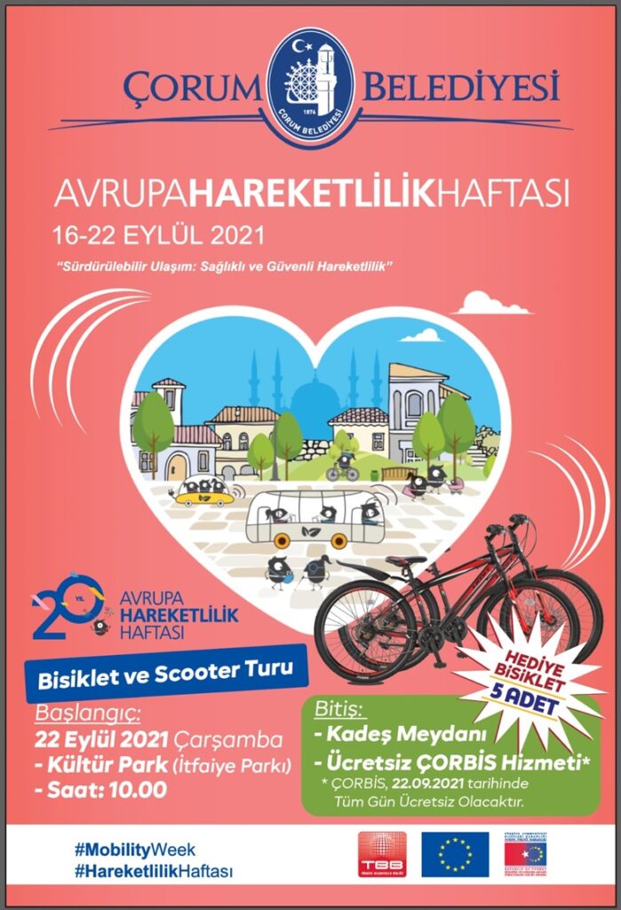 Her yıl 16-22 Eylül tarihlerini kapsayan Avrupa Hareketlilik Haftası bu yıl “Sürdürülebilir Ulaşım: Sağlıklı ve Güvenli Hareketlilik” sloganıyla kutlanacak. Çorum Belediyesi de bisiklet ve scooter turu etkinliği ile Avrupa Hareketlilik Haftası’nı kutlayacak. 22 Eylül Çarşamba günü düzenlenecek etkinlik, saat 10.00’da Kültür Park’ta başlayarak Kadeş Barış Meydanı’nda sona erecek. Çorum Belediyesi tarafından etkinliğine katılan 5 kişiye düzenlenecek çekilişle bisiklet hediye edilecek.