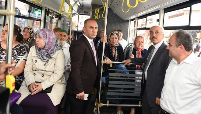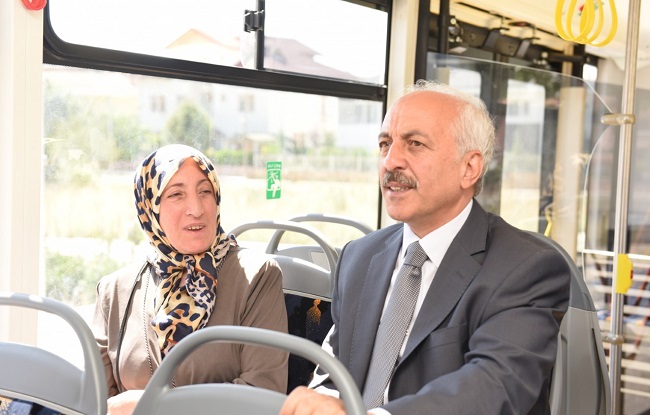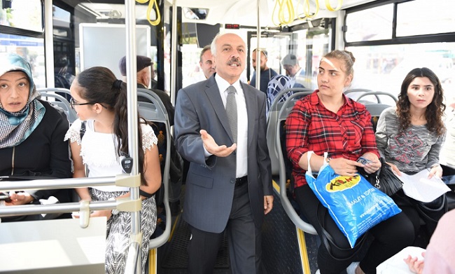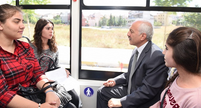 Beraberinde Belediye Başkan Yardımcısı Turhan Candan, Özel Kalem Müdürü İrfan Yiğit ve Ulaşım Hizmetleri Müdürü Lütfullah Şirin ile birlikte Binevler hattı otobüsüne binen Belediye Başkanı Zeki Gül, vatandaşlarla sohbet etti.