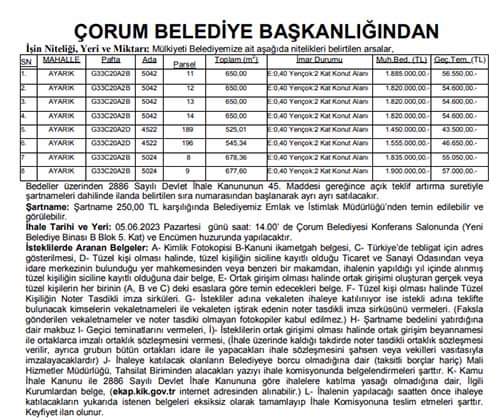 Çorum Belediyesi’nin mülkiyetindeki 8 adet villa-konut arsasını ihale usulü satacak.