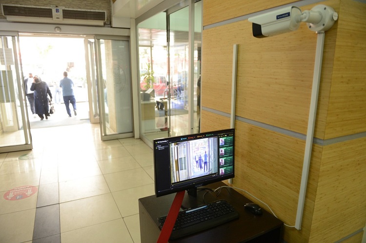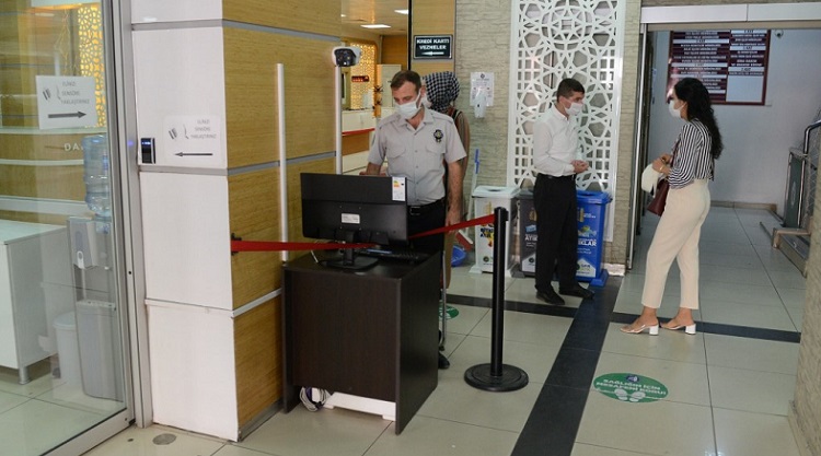 Hizmet binası girişine yerleştirilen ‘’ateş ölçer termal kamera‘’ sistemi ile binaya aynı anda giriş yapan birçok vatandaşın vücut ısısı eş zamanlı olarak ölçülebiliyor.