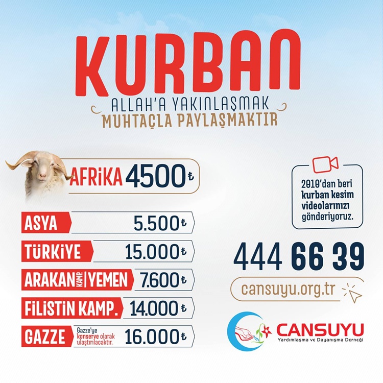 Cansuyu Derneği, kurban hisse bedellerini, Afrika’da 4 bin 500 lira, Gazze’de ise 16 bin lira olarak açıkladı.
