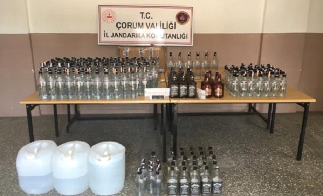 Çorum İl Jandarma Komutanlığı tarafından düzenlenen operasyonda 598 şişe kaçak içki, 539 adet sahte bandrol ve 100 litre alkol ele geçirildi.