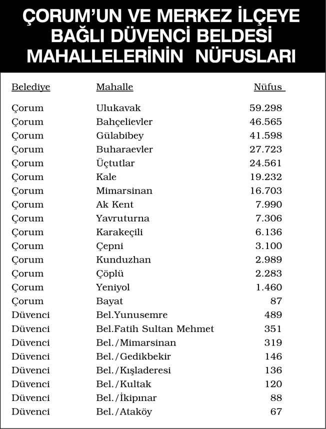 Ulukavak Mahallesi’nin nüfusu 59.298, Bahçelievler’in 46.565, Gülabibey’in ise 41.598. Buharaevler 27.723 nüfusla 4. Üçtutlar da 24.561 nüfusla 5. sırada yer alıyor. 267.032 nüfuslu Çorum’un en küçük mahallesi ise 87 nüfusla, kente yeni bağlanan Bayat.