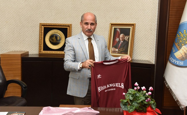 Hitit Angels takımı öğrencileri ve öğretmenler Belediye Başkan Vekili Ahmet Yabacıoğlu’na çiçek ve takımın formasını hediye etti.