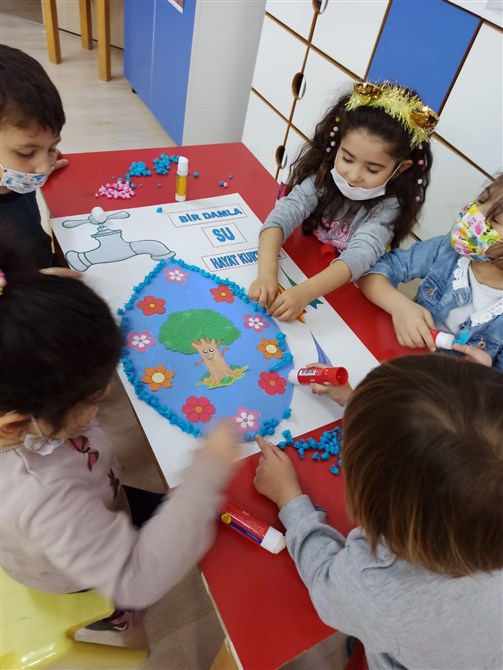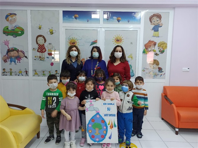 Suyun oluşumu ve su kaynakları ile ilgili eğitici film izlenerek, çeşitli sanat etkinlikleri yapıldı. Kukla ile küçük su damlasının hikayesi anlatılarak farkındalık oluşturuldu. “Bir Su Damlası Olsaydın Nereye Düşmek İsterdin” konulu beyin fırtınası yapılarak çocukların yaratıcı fikirleri alındı.