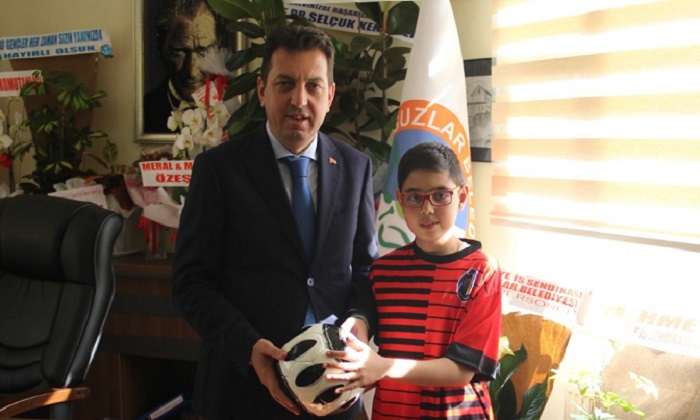 Oğuzlar U12 takımı oyuncuları minikler Belediye Başkanı Muzaffer Yıldırım’a futbol topu hediye etti.