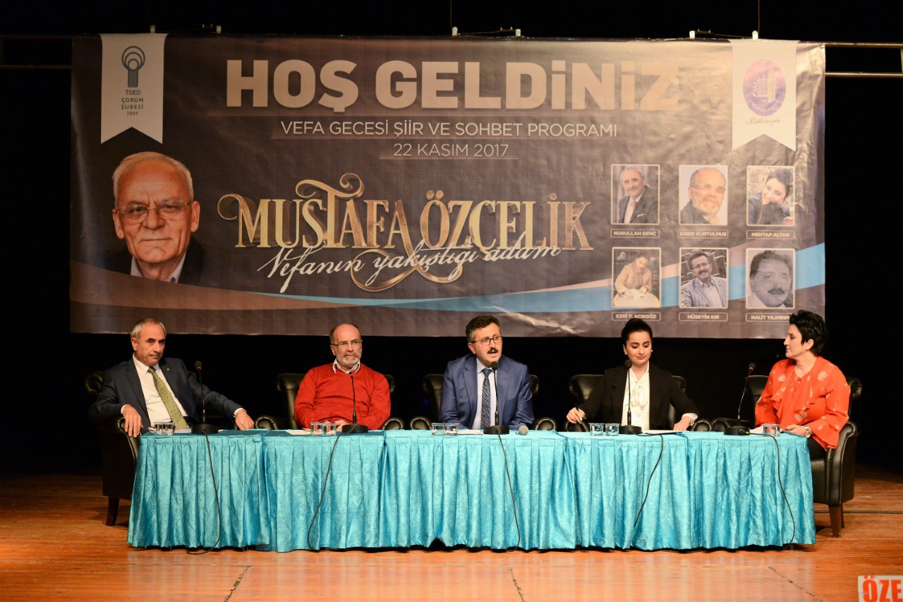 Sunuculuğunu İpek Aras ve Muhammed Şimşek’in yaptığı program, Belediye Başkan Yardımcısı ve TDED Çorum Şube Başkanı Turhan Candan’ın açış konuşması ile başladı. Konuşmasında vefanın önemine değinen Candan yaşayan Yunus Emre olarak büyük takdir gören Mustafa Özçelik’e ve programa katılan tüm katılımcılara teşekkür etti. Ardından TBMM Meclis İdare Amiri ve Çorum Milletvekili Salim Uslu, Çorum Milletvekili Ahmet Sami Ceylan ile Lütfiye İlksen Ceritoğlu Kurt’un telgrafları okundu. Şair yazar Mustafa Özçelik hakkında sunulan bir sinevizyon gösterisi ardından moderatörlüğünü Eğitimci Şair Yazar Hüseyin Kır’ın yaptığı Mustafa Özçelik Sanatı ve Kişiliği konulu panel gerçekleştirildi. Panelde Şakir Kurtulmuş, Nurullah Genç, Mehtap Altan ve Ezgi Fatma Açıkgöz; Mustafa Özçelik’in kişiliği, sanatı ve şiirleri hakkındaki görüşlerini dile getirdiler. Panel sonrası TDED Çorum Şubesi bünyesinde faaliyet gösteren Hitit Üniversitesi öğrencilerinden oluşan Künye Edebiyat Kulübü öğrencileri Mustafa Özçelik şiirlerinden oluşan bir dinleti sundular.