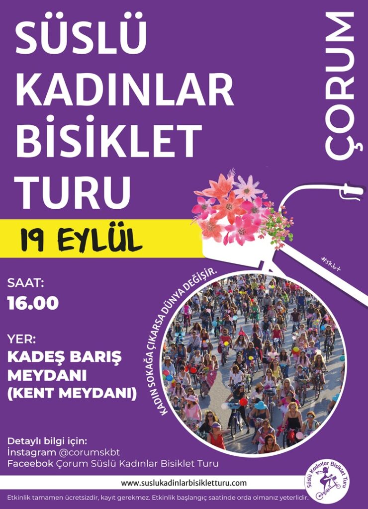 Süslü Kadınlar Bisiklet Turu Organizasyonu adına açıklama yapan Melek Gizem Çataroğlu, ‘Dünya etkinliğin ‘Otomobilsiz Kentler Günü’, ‘Sürdürülebilir ve Aktif Ulaşım’ konularına dikkat çekmek için bir farkındalık yaratmak, kadınların bisiklete binmesini teşvik etmek amacıyla gönüllü kadınlar tarafından hiçbir kurum ve kuruluşa bağlı olmadan düzenlendiğini belirterek, şöyle dedi: “İzmir’de 2013 yılında ilk kez yapılan ve şehrimizde dördüncü kez yapılacak etkinliğin, bu yıl yaklaşık 150 şehirde (25 ülkede) eş zamanlı olarak düzenlenmesi amaçlanmaktadır. Etkinliğin merkezi ve çıkış noktası İzmir’dir. Etkinlik sadece Türkiye’de değil, uluslararası platformlarda da tanınmaktadır. Bu etkinlik renkli görüntüleriyle Çorum’un tanıtımına katkıda bulunacaktır.