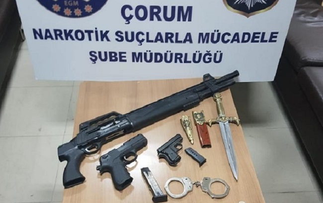 Çorum’da narkotimlerce zehir tacirlerine yönelik düzenlenen operasyonlarda uyuşturucu maddelerin yanı sıra terör örgütü FETÖ’ye ait iki kitap ile 10 adet silah ele geçirildi.