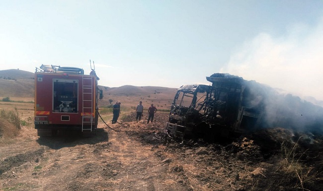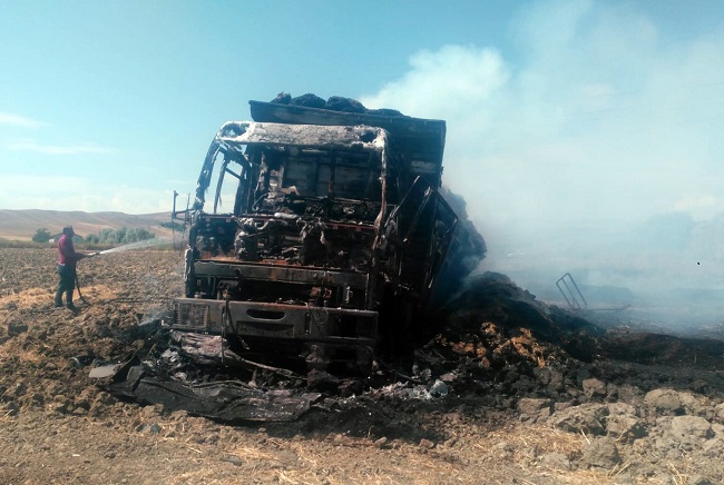 Edinilen bilgilere göre, ilçeye bağlı Yerliköy’de Mürsel Yaramış 19 FG 930 plakalı kamyonuyla tarladan saman balyalarını toplayıp kasasına yükledi. Kamyon köy çıkışında yüksek gerilim hattının altından geçerken, tellere temas eden balyalar tutuştu. Dumanı fark eden Yaramış, hemen araçtan inerek yangını söndürmeye çalıştı. Bir anda büyüyen yangın tüm kamyonu sararken, yangını söndürmeye çalışan talihsiz sürücü vücudunun çeşitli yerlerinden yaralandı.
